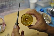 スプールを片手で回しドライブシャフトピンをはめ込みます。