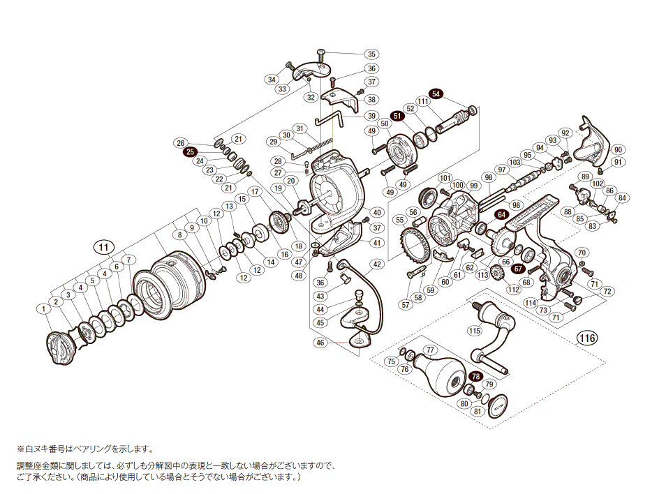 ・シマノ、ダイワのホームページの展開図で、部品番号・部品コードのない部品。