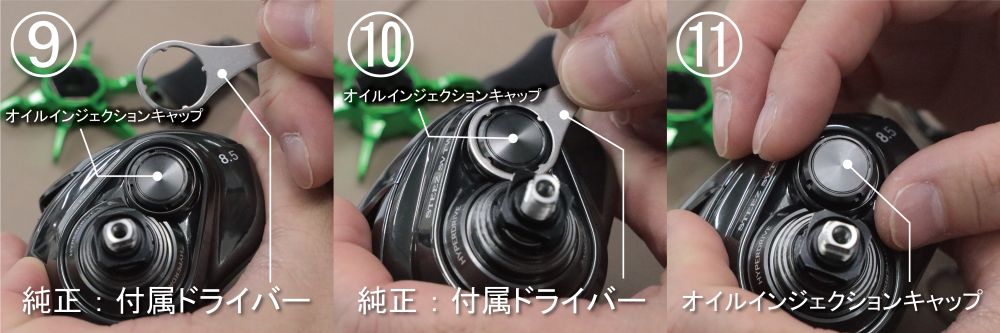 (10)「オイルインジェクションキャップ」に専用ドライバーの凹凸を合わせて緩めます。