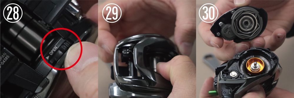 まず、リール本体裏側、赤丸部のストッパーレバーをOPEN方向にスライドさせてから、(29)「サイドプレート」を外します。