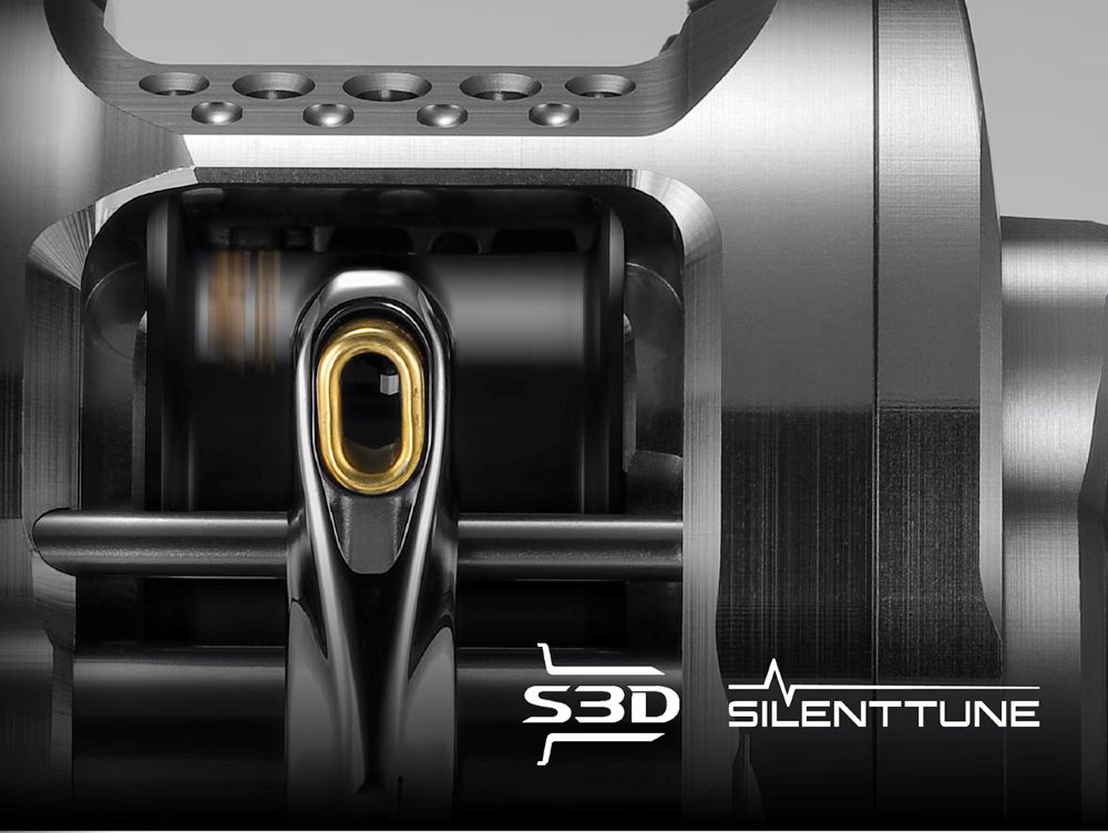 スプール精度を高める切削テクノロジー・S3D、スプールを保持するベアリングに軽い圧力をかけて高速回転時の振動を減少させるサイレントチューンもキャストパフォーマンスの向上に大きく寄与。