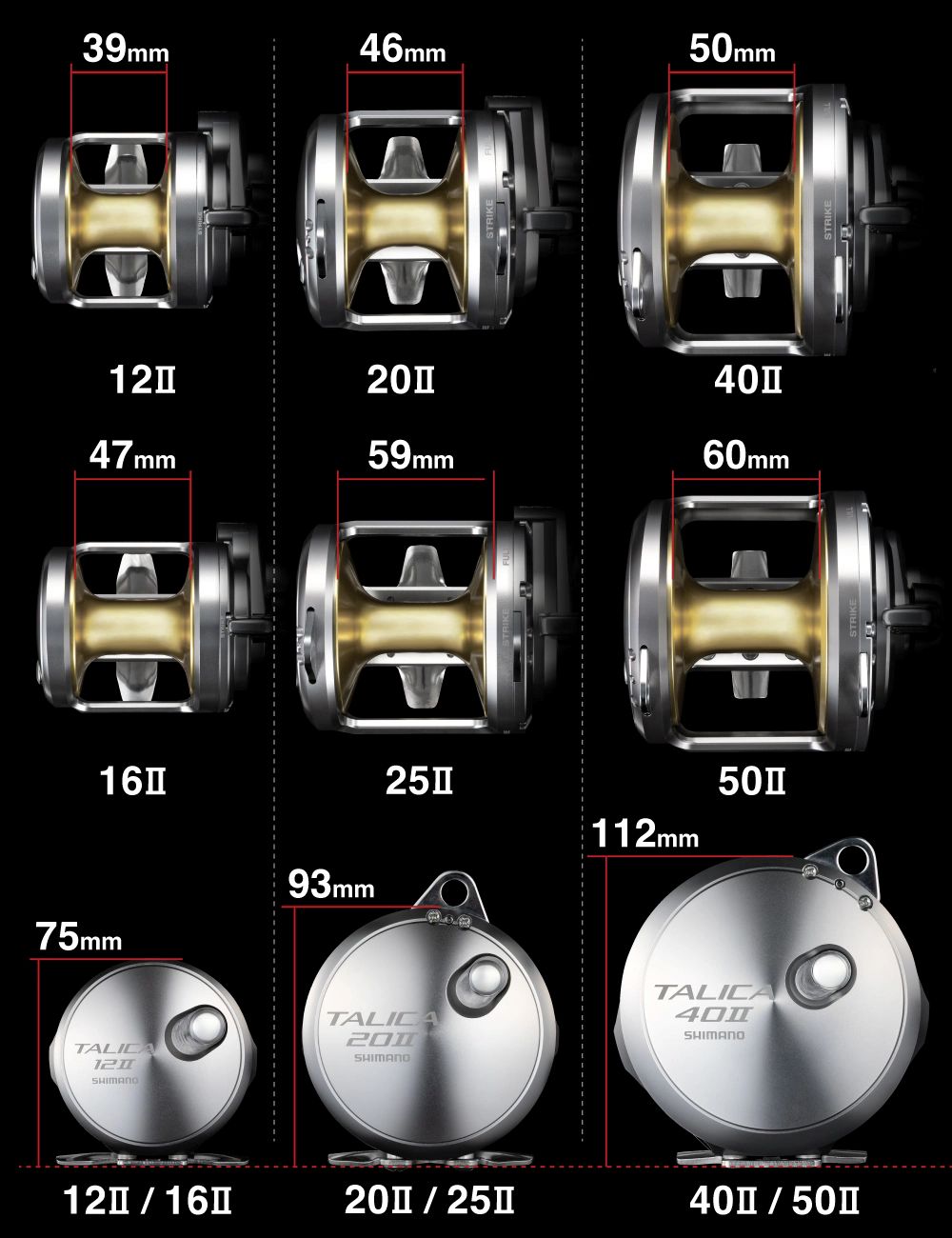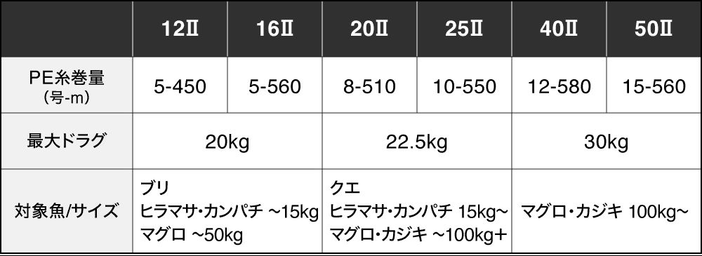 20IIはクエや大型カンパチ狙いの泳がせ、25IIは100kg超のキハダ、クロマグロのライブベイトやフカセ釣り、そして40II&50IIは200kgオーバーのクロマグロ、カジキにも余裕で対応。