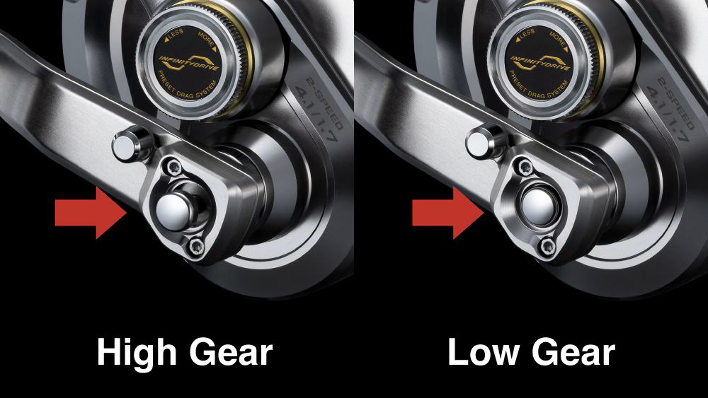 スピーディなライン回収に適したハイギアから、ターゲットとのパワフルなファイトを有利に運ぶローギアへ、簡単かつスムーズにシフト。