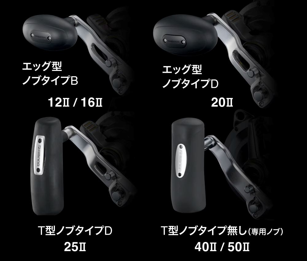 また、ハンドルノブは12II/16IIにはエッグ型(ノブタイプB)、20IIにはエッグ型、25IIは今作よりT型(ノブタイプD)に変更、40II/50IIにはT型(専用ノブ)を搭載。