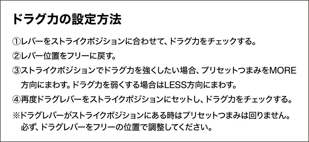 ※最大ドラグ力とはプリセットツマミをスプールフリーが出なくなる直前まで締めたときのFULLポジションでのドラグ力です。
